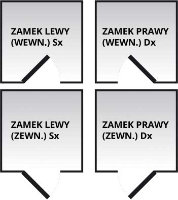 W zamkach z funkcją klamki, ze względu na odpowiednie ustawienie rygla zatrzaskowego niezbędne jest nie tylko podanie stronności (lewy, prawy), ale także informacji na temat otwarcia drzwi - otwierane na zewnątrz pomieszczenia lub do wewnątrz (zewn. / wewn.) patrz rysunek.